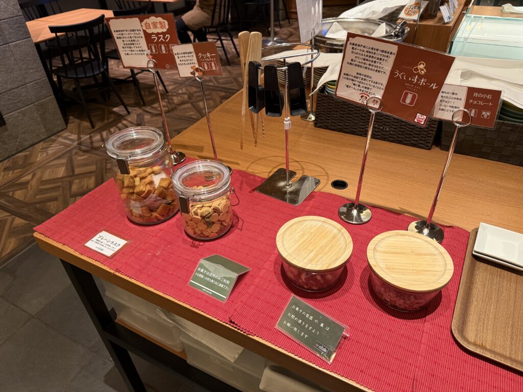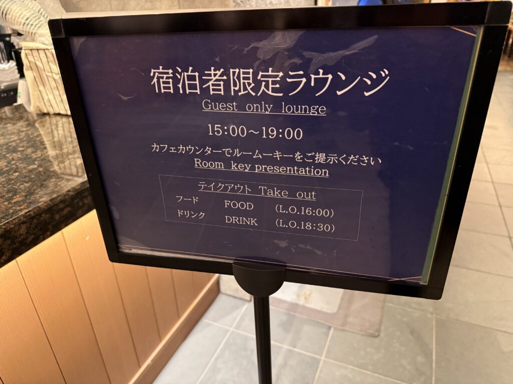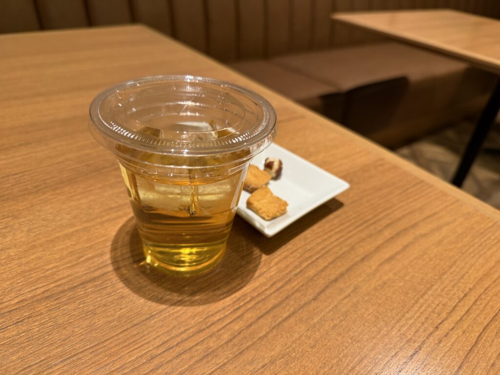 カードキーを見せると無料でドリンクを頼めてちょっとしたお菓子も食べることができました。